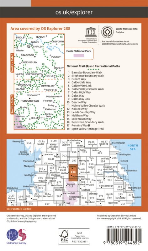 Map sheet number 288 in the OS Explorer series covers a section of the Peak District National Park to the south of Huddersfield. There are numerous walks to enjoy in this area including the Pennine Way, Holme Valley Circular Walk, Kirklees Way, Calderdale Way near the towns of Bradford, Halifax, Brighouse and Bingley. |