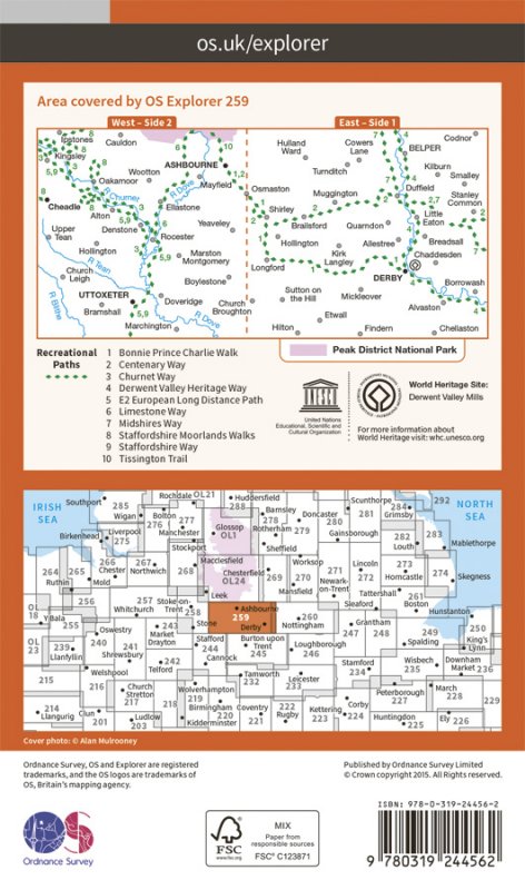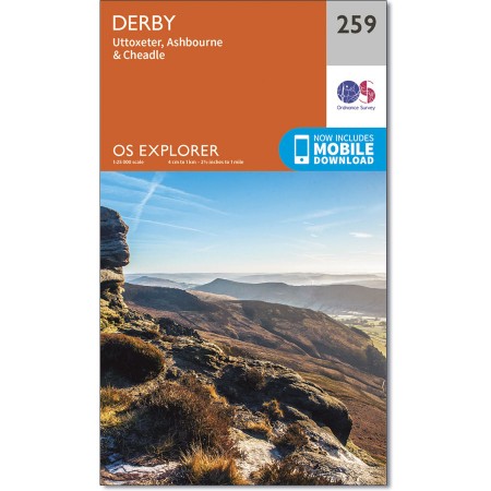 Map sheet number 259 in the OS Explorer series covers Ashbourne, Uttoxeter, Cheadle and Derby in the Peak District National Park. Highlights of the area include: River Dove, River Churnet, and long distance paths such as Centenary Way, Derwent Valley Hertitage Way, and the Tissington Trail. |