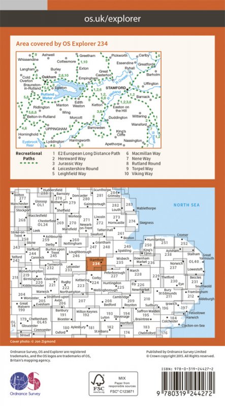 Map sheet number 234 in the OS Explorer series covers the area around Rutland Water, including the towns of Oakham and Stamford. Rutland Water reservoir is a nature reserve as well as a water sports location, and can be explored by walking the Macmillan Way and Rutland Round. Other highlights of the area include Jurassic Way, Hereward Way, Torpel Way. |
