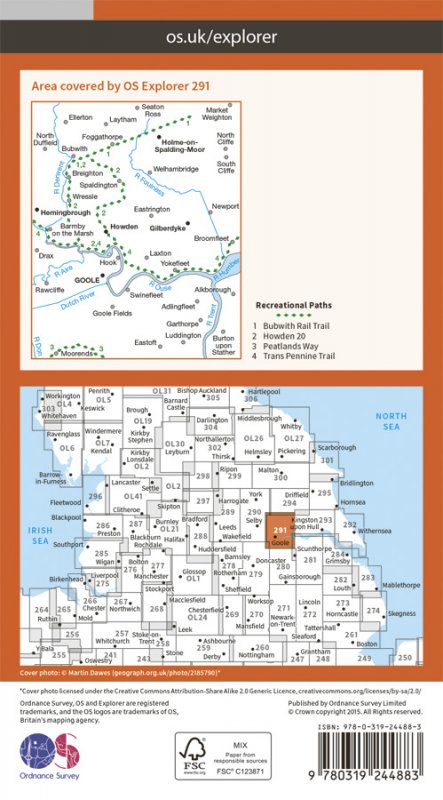 At the start of the Humber, OS Explorer Map 291 shows the Rivers Ouse and Trent, the town of Goole and the Surrounding area. Highlights include the Bubwith Rail Trail, Hoden 20 Recreational Path and the Trans Pennine Trail.