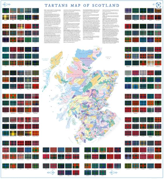 Double sided combined map featuring the Scotland of Old Map on one side and the Tartans Map on the other. Discover Scotland with this authoritative guide to clans, tartans, and their origins. These popular maps are highly detailed, showing hundreds of arms, official insignia, crests, and tartans of the Scottish clans. This beautifully illustrated map is both decorative and informative. |