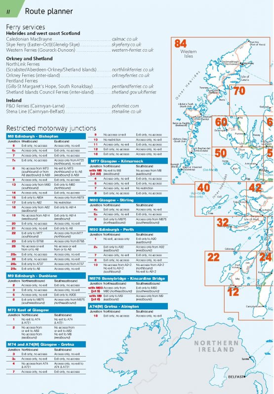 This handy atlas fits in the glovebox of your car, perfect for quick referencing on the move. Including information on route planning, car ferry routes and operators, restricted motorway junctions, county map and a distance chart, this is the perfect glovebox companion for traveling through Scotland. The clear mapping shows a range of features including award winning beaches, football stadia, tourist attractions, waterfalls, service areas, steep gradients and road tolls. |