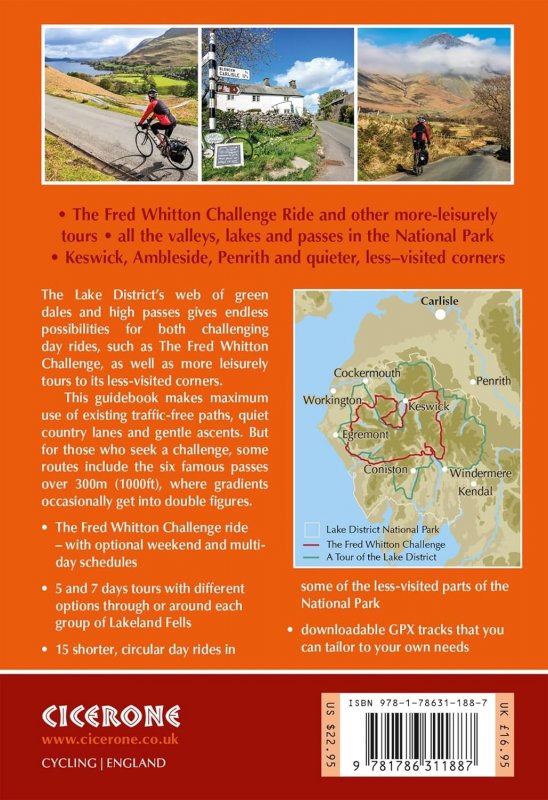 Guidebook to a 5-day cycle tour of the Lake District plus 15 challenging day rides from Keswick, Ambleside, Penrith and bases southwest and southeast of the National Park. Details 2 options each day for the cycle tour, plus a 7-day alternative itinerary. Also outlines other tours including the 112-mile Fred Whitton Challenge, which takes in 7 iconic passes.